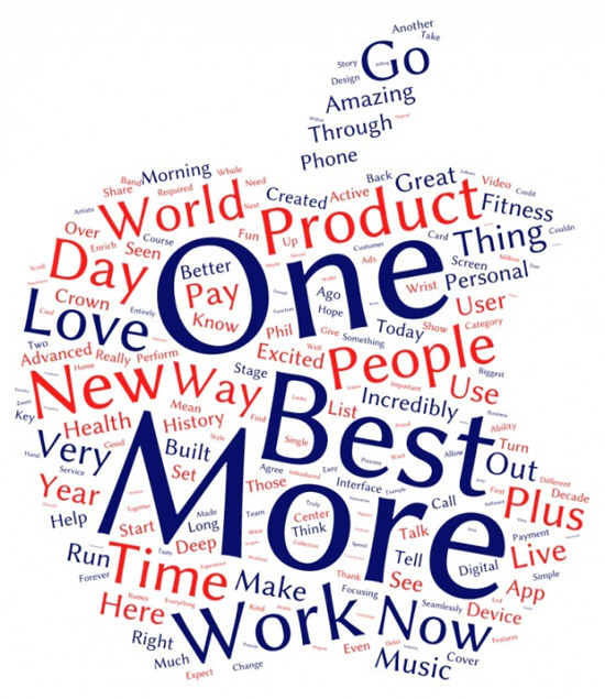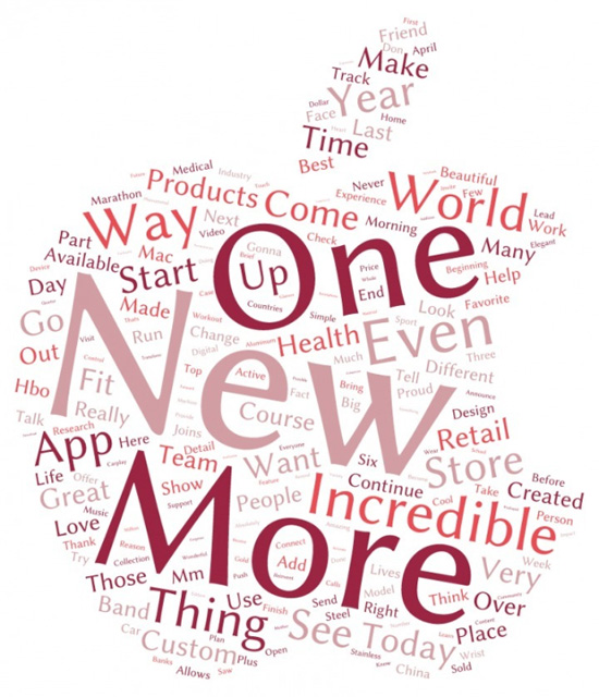 Кто-то скажет, что компании больше нечем удивить потребителя, но такой подход на сегодня характерен не только для Apple. В современном мире все большую роль играют субъективные ощущения человека от использования того или иного устройства, некая эмоциональная составляющая, и Кук отлично это понимает, делая ставку на слова “новый”, “более”, “невероятно”, “иначе”, “мир”, “люди”, а также различные их вариации. Например, в позапрошлый понедельник он употребил различные формы прилагательных “невероятный” и “красивый” в общей сложности почти тридцать раз. Хотя такие описания не отражают свойств продукта как такового, они дают потенциальным покупателям возможность понять, какими будут ощущения от его использования.