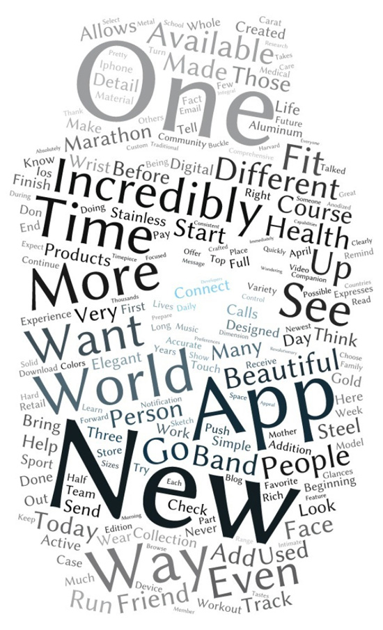 Визуализация речи Джобса, посвященной iPod, отлично демонстрирует сделанный им упор на донесение до зрителя различных аппаратных характеристик. Например, слово “батарея” упоминается одиннадцать, а название шины Firewire — целых тринадцать раз. Кроме того, Стив посвятил значительную часть презентации непосредственно описанию возможностей гаджета, применяя термины “плеер”, “музыка”, “диск” и так далее. Тим же, напротив, уделяет таким вещам гораздо меньше времени — даже обозначения материалов вроде нержавеющей стали и алюминия нынешний глава корпорации употребил всего по четыре раза, остальные же технические особенности Watch и вовсе практически не упоминаются.