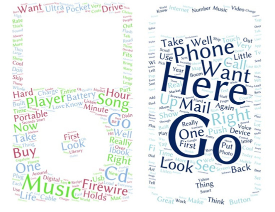 Впрочем, уловить смысл без контекста может быть достаточно сложно, и для пущей наглядности предлагаем вам взглянуть на результат визуализации слов легендарного Стива Джобса, которого Кук сменил на посту генерального директора купертиновского гиганта. Изображения ниже иллюстрируют его речи по случаю выпуска продуктов, кардинально изменивших облик современной индустрии — iPod (слева) и iPhone (справа) в 2001 и 2007 годах соответственно.