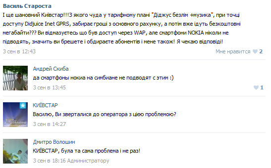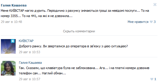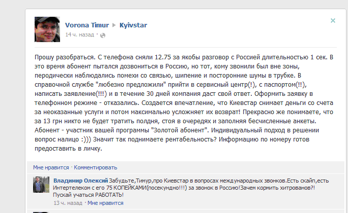 Увы, помочь не удалось – PR служба направила нас все в тот же центр обслуживания абонентов. Попытки доказать, что поездка куда-то по городу в рабочее время, чтобы забрать 13 грн - абсурд, успехом не увенчалась (как минимум час «путешествий» и еще столько же - на формальности и написание заявления). По словам представителей оператора, личная явка с паспортом в ЦОА необходима для того, чтобы абонент доказал, что он не мошенник (почти цитата). Зато в процессе общения с PR-службой Киевстара, пользователи Facebook подбросили массу интереснейшего материала. Как оказалось, проблемы с биллингом не у нас одних.