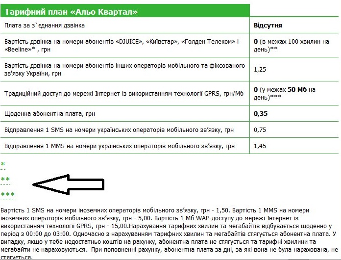 * Списання кожної окремої тарифної хвилини, що надається в межах щоденного обсягу тарифних хвилин, здійснюється в першу секунду кожної хвилини розмови.