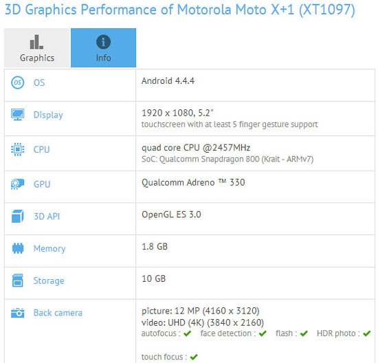 Несколько дней назад Moto X+1 был замечен в базе данных GFXBenchmark. По данным бенчмарка, в конфигурацию устройства вошел экран диагональю 5,2 дюйма разрешением Full HD, 2 ГБ оперативной и 16 ГБ встроенной флэш-памяти, камеры разрешением 2 и 13 Мп (последняя обеспечивает запись видео разрешением 4К). Аппаратная основа изделия — SoC Qualcomm Snapdragon 801, программная — Android 4.4.4. Однако нет никаких сомнений в том, что через какое-то время после выпуска для Moto X+1 станет доступна ОС Android L.