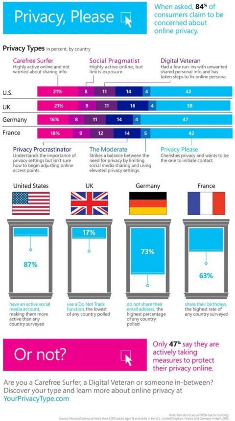 Далее из опроса следует, что в разных странах люди по разному относятся к выкладыванию персональной информации на всеобщее обозрение. Так, во Франции 67% пользователей не скрывают на форумах и в социальных сетях дату своего рождения, тогда как в США таких лишь 56%, в Великобритании 48%, а в Германии 47%. Результаты исследования компания представила в виде инфографики.