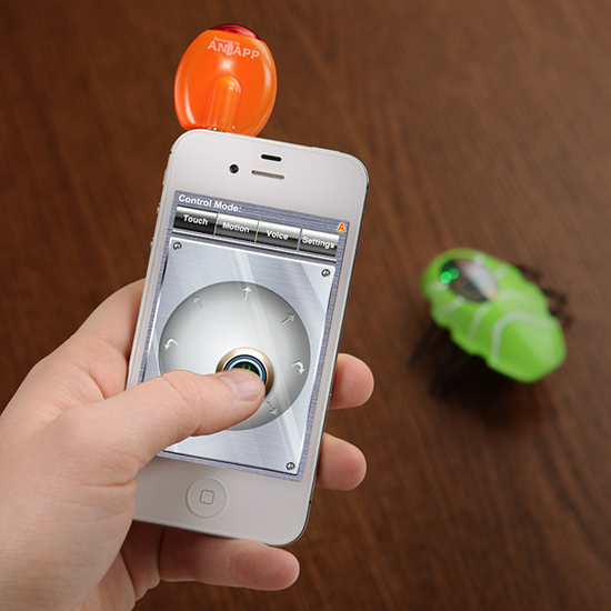 Чтобы смартфон смог управлять роботом, ему требуется внешний аксессуар под названием Smartphone Controlled Insectoids. С его помощью можно будет контролировать 8 направлений движения жука. Подключается гаджет в разъем наушников, который есть практически в любом умном телефоне. Сам робот общается со смартфоном по инфракрасному лучу (именно поэтому смартфону требуется дополнительный аксессуар).