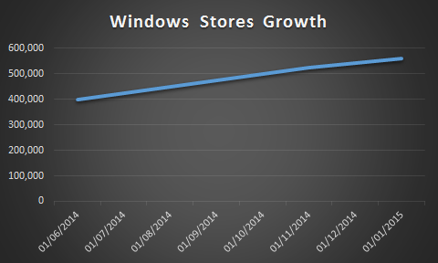 Пока магазины Google Play Store и App Store уже давно превысили планку в миллион приложений, Windows Phone Store по-прежнему пытается догнать конкурентов. Согласно новому отчёту компании Microsoft, на данный момент число доступных приложений в магазинах для Windows Phone и Windows 8 составляет 560 000, что демонстрирует стабильный рост начиная с 525 000 приложений 14 ноября 2014 года и 400 000 - от 27 июня того же года. Однако в последние несколько месяцев всё же заметен некоторое уменьшение роста числа приложений.
