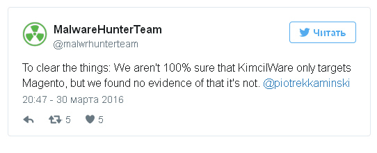 Исследователи MalwareHunterTeam обнаружили нового шифровальщика — KimcilWare. Этот вредонос атакует не простых пользователей, а веб-серверы магазинов, работающих на базе Magento. Зашифровав всю информацию на сервере, KimcilWare подменяет главную страницу сайта сообщением «веб-сервер зашифрован» и требует за восстановление данных либо 1 BTC (немногим больше $400), либо просто $140.