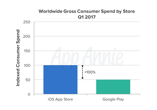 В целом App Store продолжает приносить больше прибыли разработчикам, чем Google Play. В первом квартале 2017 отрыв увеличился до 100%. По количеству скачиваний продолжает лидировать Google Play.