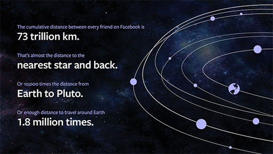 По данным Facebook, суммарное расстояние между друзьями по соцсети составляет 73 триллиона километров. Это примерно в 10 тысяч раз превышает расстояние между Землей и Плутоном или в сумме равно 1,8 миллиона путешествий вокруг Земли.