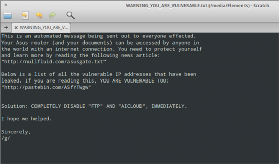 Это автоматическое сообщение, которые выслано всем пострадавшим. Доступ к вашему маршрутизатору Asus (и вашим документам) может получить кто угодно в мире, имеющий выход в интернет. Вам нужно защитить себя и прочитать информацию в этой новости: http://nullfluid.com/asusgate.txt.