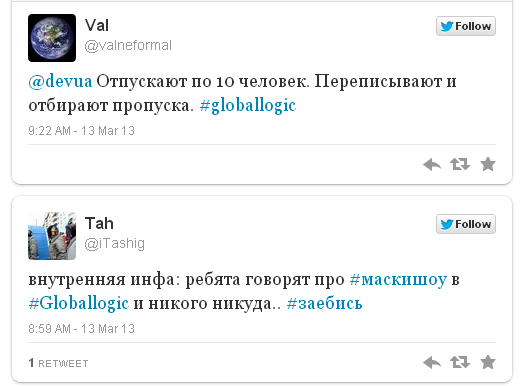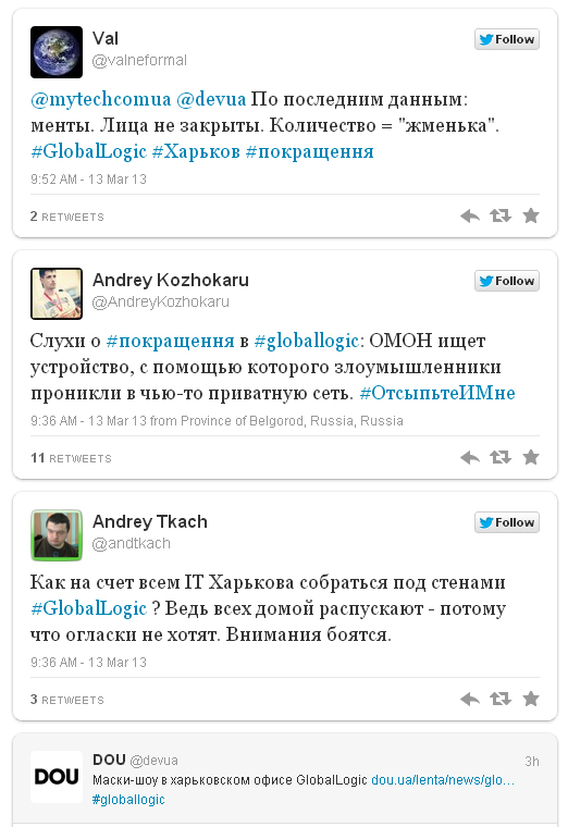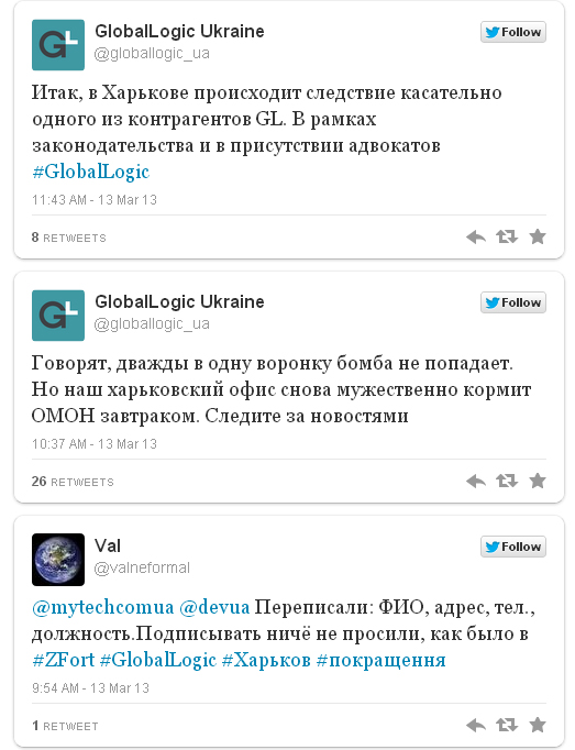 Сегодня с утра в твиттере появились упоминания о том, что рабочий день в харьковском офисе GlobalLogic начался с неожиданного визита ребят в масках. К слову — это уже второй наезд правоохранительных органов на харьковское представительство — первые “смотрины” состоялись в феврале 2011 и особой огласки не получили.