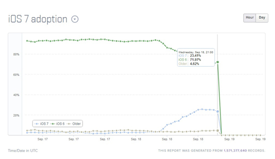 Как видно из графика, обновляющегося в режиме реального времени, на момент написания статьи iOS 7 была установлена уже на 23,4% мобильных устройств Apple. Показания строятся на основании использования интернет-трафика различными мобильными устройствами, в том числе работающими под управлением iOS, в более чем 1420 предприятиях.