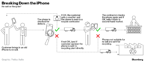 После этого устройство отправляется на более тщательное тестирование, которое выявляет, может ли телефон быть отправлен на перепродажу или же он должен быть переработан. Если телефон не подходит для последующего использования, Apple следит за каждым шагом, пока каждый компонент смартфона не превратится в пыль. В то время как многие производители сохраняют целостность некоторых микросхем и других компонентов, используя их для восстановления других устройств, Apple предпочитает все стирать в порошок.