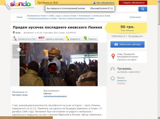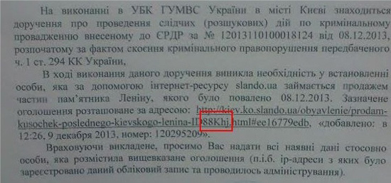 Управление по борьбе с киберпреступностью столичного управления МВД хочет найти людей, которые продавали части Ленина на сайте частных объявлений Slando.ua. Это следует из запроса управления, адресованного администрации сайта. Копия его фрагмента оказалась в распоряжении редакции.