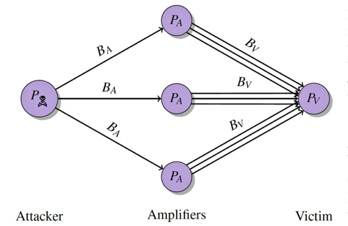 Используя уязвимость, злоумышленник (Attacker на приведенной ниже схеме) отправляет в торрент-клиент на ПК пользователей (Amplifiers) запрос на инициализацию пирингового соединения. Однако в сообщении IP-адрес инициализатора заменен на IP-адрес компьютера, на который необходимо совершить атаку.
