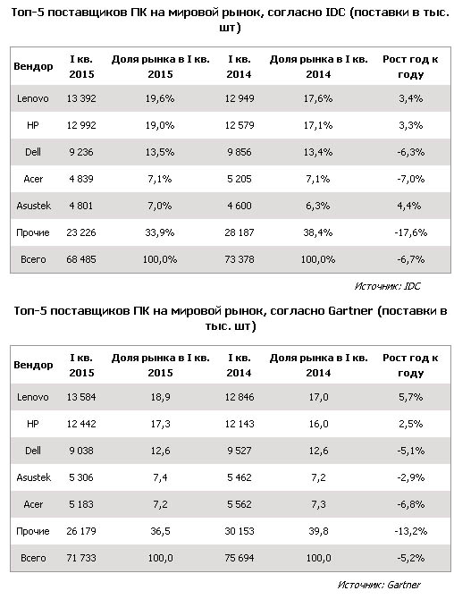 Поставки персональных компьютеров в I квартале 2015 г. на мировой рынок упали на 6,7% в сравнении с аналогичным периодом 2014 г. до 68,5 млн штук, по данным IDC. Согласно Gartner, снижение составило 5,2% — до 71,7 млн устройств.
