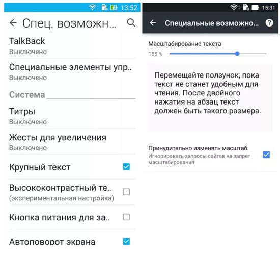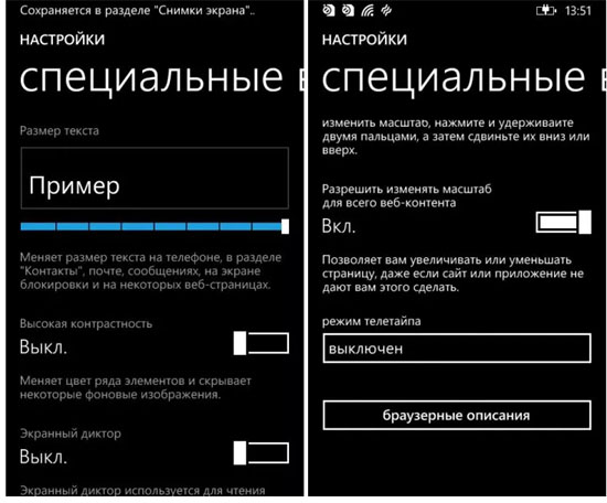 В Windows Phone и Android пункт спрятан в разделе настроек «Специальные возможности». В интерфейсе «плиточной» платформы там же находится галка для изменения размера шрифта в браузере и сторонних приложениях. В операционке от Google масштабирование на страницах включается непосредственно в конфигурациях программы.