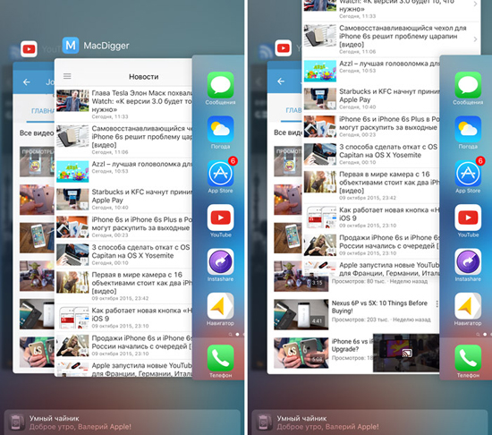 Возможно, большинство не поверит и подумают, что это ошибка употреблять термины «фоновые приложения» и «энергоэффективность» в одном предложении. Уверяем, оговорки и прочие погрешности в терминологии исключены. Многозадачность запускается двойным нажатием на кнопку «Домой». А полное закрытие программ осуществляется смахиванием окошка вверх (справедливо для iOS 9).
