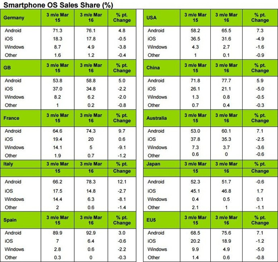 Максимальной доли Android добилась в Испании, где ее доля рынка превышает 92%. Наименьшая доля зарегистрирована в Японии — 51,7%. Второе место остается за iOS, которая лучше всего чувствует себя в Японии, — 46,8%. В США ее доля составляет 31,6%, Китае — 21,1%.