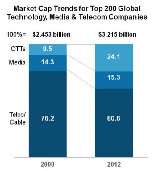 Доля операторов в общей рыночной капитализации двухсот крупнейших технологических, медийных и коммуникационных компаний сократилась более чем на 16 процентов и составила 60,6 процента.