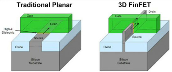 Важен переход от от плоскостного дизайна транзисторов на чипе к пространственному их построению FinFET. В связи с нынешними крохотными размерами транзисторов появляются проблемы утечки энергии вследствие того, что затвор в планарной архитектуре не способен осуществлять полный контроль над каналом исток-сток. В рамках подхода FinFET затвор фактически обернут вокруг канала, а не просто лежит поверху, соответственно ведется более жесткий электростатический контроль.