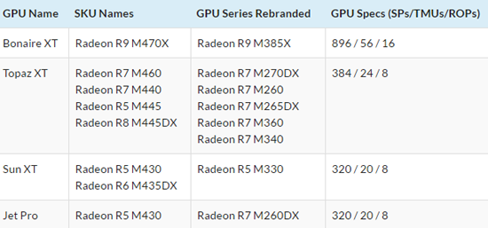 Серия M400 будет использовать четыре графических ядра, сейчас продающихся под маркой Radeon M300 или M200: Jet Pro, Sun XT, Topaz XT и Bonaire XT. Каждая из моделей в вышеприведённой таблице получит разные конфигурации подсистем памяти и тактовых частот. Основные спецификации, такие как количество унифицированных процессоров, текстурных блоков и модулей растровых операций приведены там же. В таблице мы не видим решений с номерами M480 и M490. Ожидается, что в их качестве выступят архитектуры Tonga и Polaris 11 соответственно, но в драйверах упоминаний об этих чипах пока не найдено.