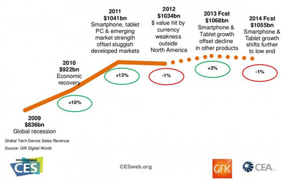 Однако самого по себе этого недостаточно, чтобы уверенно смотреть в будущее. То, что мы сейчас переживаем, не наша с вами заслуга: это плоды технической революции конца XX века (вспомните Palm) и бурной пятилетки после рождения iPhone. А мы движемся по инерции. И ход мобильного локомотива замедляется! Вот вам красивый график для мирового рынка высокотехнологичной бытовой электроники за шесть лет с прогнозом на год начавшийся:
