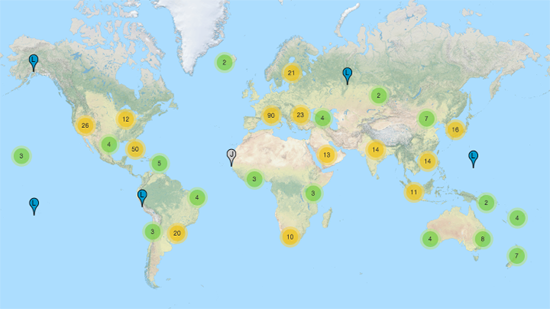 Не секрет, что мало кто размещает свои данные у себя в офисе или в квартире/на балконе/в гараже. Основная часть данных сосредоточена в дата-центрах, которых на данный момент известно 3269 в 102 странах. Все они в лучших традициях нанесены на удобную карту (кстати, помимо карты на сайте есть подробная информация о связности и возможных характерных угрозах для каждой страны). Дата-центры разбросаны по всем материкам, кроме Антарктиды, по одному есть даже на Гренландии и в Океании.
