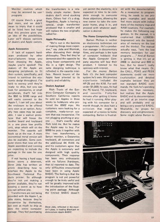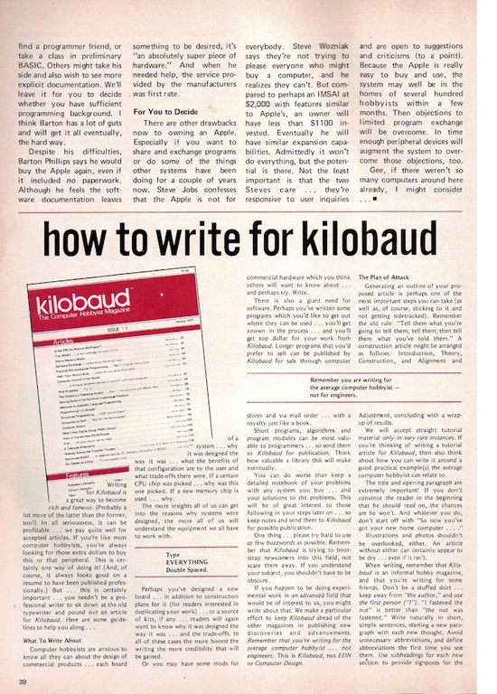 Автором исторического материала стала журналистка Шейла Крейвен. Статья вышла под заголовком "Выдающийся компьютер Apple" в одном из номеров журнала Kilobaud. В преддверии запуска нового продукта Шейла взяла интервью у Стива Джобса и Стива Возняка.
