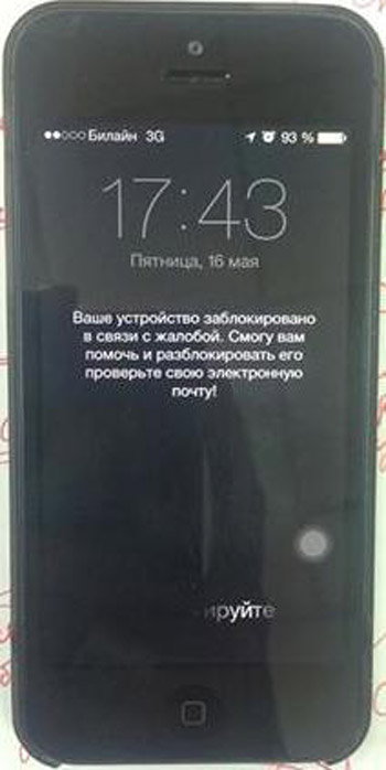 Обладатель «яблочного» телефона обнаруживает свое устройство в заблокированном виде, а на дисплее уведомление следующего содержания: «Ваше устройство заблокировано в связи с жалобой. Смогу вам помочь и разблокировать его. Проверьте свою электронную почту!».