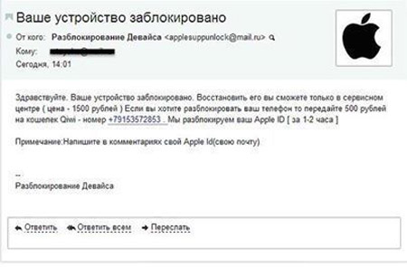 К этому времени на почту владельца смартфона приходит письмо с почтового ящика applesupportunlock@mail.ru, в котором ему сообщают, что он может разблокировать iPhone в сервисном центре за 1500 рублей или же сделать это всего за 500 рублей. Для второго варианта необходимо всего лишь перечислить на определенный Qiwi-кошелек необходимую сумму. Неожиданно возникший «спаситель», обещает устранить проблему через 1-2 часа после поступления средств.