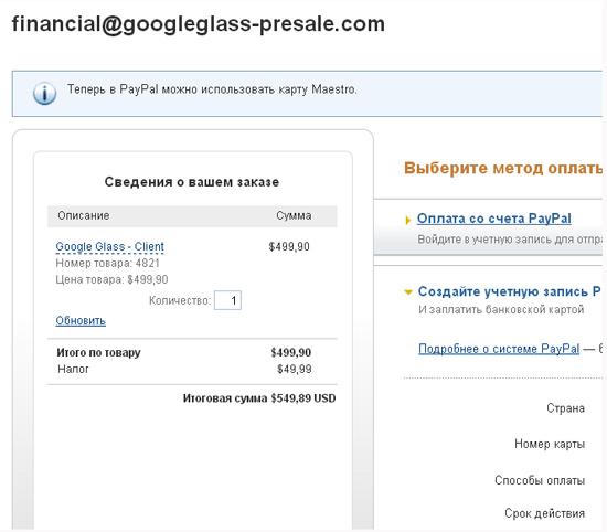 В интернете уже появились сайты, где вовсю идёт приём предварительных заказов на очки Google Glass. Естественно, эти магазины не имеют никакого отношения к компании Google, а принадлежат мошенникам, хотя дизайн сделан весьма профессионально.