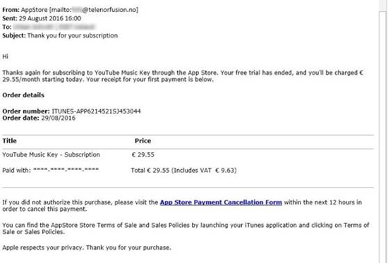 Потенциальная жертва получает рассылку от лица App Store (на самом деле, мошенники используют почтовый ящик, зарегистрированный на норвежском домене). В письме говорится, что пользователь подписан на сервис YouTube Music Key. Теперь же, как утверждают мошенники, триальный период окончен, и ежемесячная плата за использование сервиса составит 9,55-29,55 евро – в зависимости от подключенных опций.