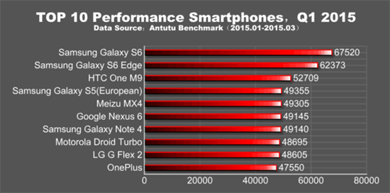 По итогам первого квартала 2015 года разработчики AnTuTu предоставили свежий рейтинг самых производительных смартфонов, протестированных в их бенчмарке. Верхние строчки такого списка ожидаемо заняли флагманы Samsung и HTC, анонсированные в начале марта. Указанное количество баллов — средний результат по итогам всех тестирований данных моделей.