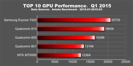 Также разработчики AnTuTu предоставили график по производительности графических ускорителей, в соответствии с которым лидером также является Exynos 7420 с Mali-T760, следом — три процессора Qualcomm с ускорителями Adreno, ну и замыкает MediaTek MT6595 c PowerVR G6200 MP4, который чуть ли не вдвое уступает лидеру. Все, в общем-то, вполне ожидаемо.