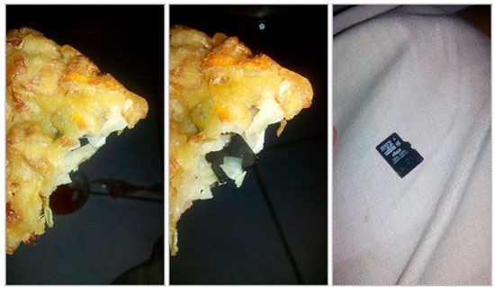 Пользователь Facebook Рама Алексист, живущий в Джакарте, рассказал о небычной находке, сделанной им при поедании овощных оладий – традиционной индонезийской закуски, представляющей собой жареные овощи в жидком тесте. Внутри фастфуда он обнаружил карту памяти microSD ёмкостью 4 ГБ. Удивительно, но после приготовления она продолжала работать. Никаких ценных сведений мужчина на карте не нашел, только одну "нечёткую фотографию". Индонезийский портал KapanLagi Plus отмечает, что мужчине несказанно повезло, ведь одна овощная оладья стоит примерно в тридцать раз дешевле, чем карта microSD на 4 ГБ. Неизвестно, отдал ли Рама Алексист карту памяти продавцу, у которого купил закуску, или оставил себе.