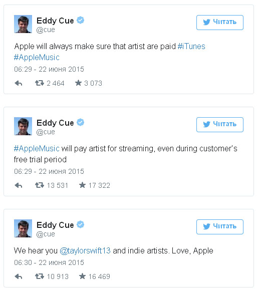 Удивительно, но Apple прислушалась к музыкантам. В своем Twitter Эдди Кью написал, что они готовы прислушаться к Taylor Swift и начать платить музыкантам сразу после запуска Apple Music, даже в бесплатный трехмесячный период, когда компания не будет получать платежи от пользователей.