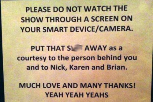 Похоже, музыканты тоже не разделяют ажиотажа вокруг использования современных гаджетов на концертах. Американская индии-группа Yeah Yeah Yeahs честно попросила своих фанатов убрать все записывающие устройства подальше, причем в довольно доходчивой форме. Замеченный на концерте группы в Нью-Йорке постер гласит: