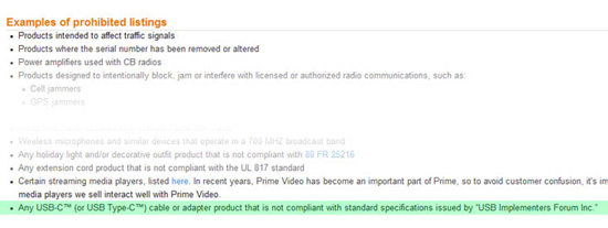 Риск повредить технику неправильными шнурами USB-C заставил Amazon, предоставляющего свою площадку сторонним продавцам, расширить список товаров, которые запрещены к продаже. В новой редакции списка появились кабели и переходники с разъемами USB-C, которые не соответствуют стандарту.