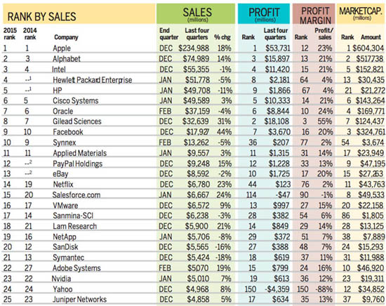 Первое место в рейтинге заняла Apple, у которой прошлогодние продажи составили $235 млрд. Следом идёт компания Alphabet, заработавшая за год $75 млрд. У занимающей третью позицию Intel значение выручки достигло почти $55 млрд. Чипмейкеру удалось опередить HP с доходом в $52 млрд. Пятёрку лучших замыкает Cisco — $49,5 млрд. Как отмечают авторы рейтинга, Apple принадлежит 28% от общей суммы доходов корпораций Кремниевой долины.