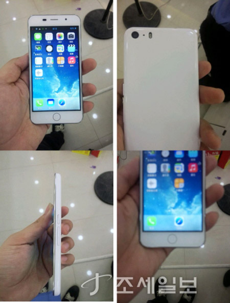 На изображении можно видеть телефон с большим дисплеем в пластиковом корпусе белого цвета. Есть сканер отпечатков пальцев и двойная светодиодная вспышка. На экране запущена операционная система, напоминающая по виду iOS 7. Сетка иконок приложений выглядит иначе – адаптирована под большой размер экрана. В целом же общая концепция дизайна модели следует «яблочным» трендам.