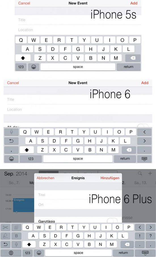 Пользователи iPhone 6 и iPhone 6 Plus из Германии, где новые смартфоны стали доступны для предзаказа, рассказали об интересных особенностях «яблочных» новинок. Как сообщает портал iPhone-ticker.de, стандартные клавиатуры на новых смартфонах используют преимущества дисплеев с диагональю 4,7 и 5,7 для новых кнопок.