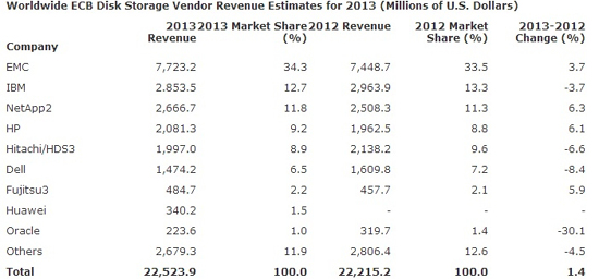 Крупнейшим производителем внешних хранилищ остается EMC с рыночной долей в 34,3% по итогам 2013 года против 33,5% годом ранее. Выручка от ECB-продуктов компании составила $7,7 млрд долларов, за год увеличившись на 3,7%. Такой же показатель динамики, но со знаком минус зафиксирован у корпорации IBM. Та заработала на внешних хранилищах данных $2,8 млрд, что соответствует 12,7% в объёме мировых продаж этих изделий.