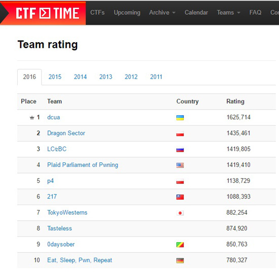 Хакерская команда КПИ имени Игоря Сикорского под названием «dcua» добыла звание самой сильной в мире за 2016 год в сфере кибербезопасности по версии CTF (Capture the flag).