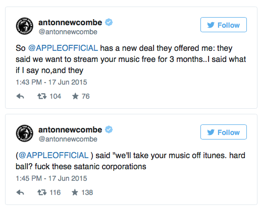 Антон Ньюкомб, фронтмен The Brian Jonestown Massacre, рассказал в своем Твиттере об ультиматуме, поставленной музыкантам: за отказ от стриминга материалов группы Apple пообещала изъять их альбомы из iTunes.