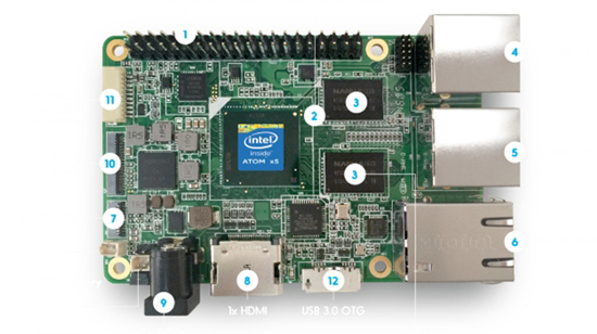 Компьютер оборудован четырёхъядерным процессором Atom x5-Z8350, имеет на борту 4 ГБ оперативной памяти, два USB 2.0, один USB 3.0, гнездо Ethernet, HDMI 1.4b, интерфейс CSI, универсальный 40-контактный разъём и 32 ГБ флеш-памяти. Словом, маленький и шустрый ПК, который прямо «из коробки» ладит с Ubuntu и Windows 10.