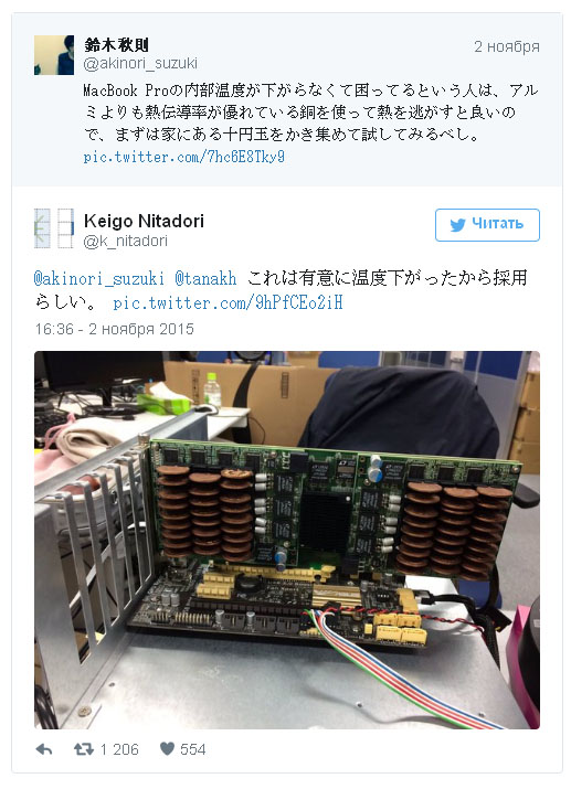 Изобретение Сузуки быстро нашло множество последователей. В качестве ответа на его твит другой житель Японии Кейго Нитадори опубликовал фотографию, на которой виден открытый системный блок компьютера, где монеты охлаждают компоненты.