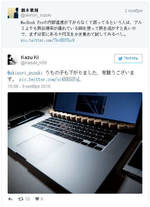 Японский музыкант Акинори Сузуки нашел достаточно оригинальный способ охладить в жаркую погоду свой ноутбук MacBook Pro. Для этого он использовал несколько десятков медных монет, которые разложил на алюминиевой поверхности корпуса под экраном.