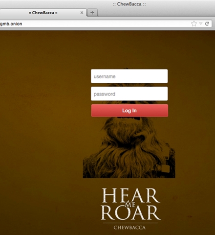 Сервер размещен по адресу http://5jiXXXXXXXXXXgmb.onion. Ссылка ведет на страницу ввода логина и пароля с фоновым изображением, на котором изображен персонаж «Звездных Войн» Чубакка.