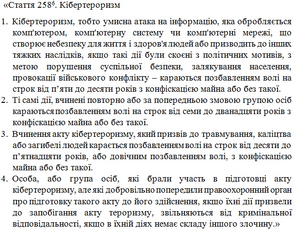 Авторы законопроекта 2439а решили пойти другим путем. В своем творении они решили дополнить УК Украины статьей 258-6 (кибертерроризм), в которой предложили собственную трактовку этого понятия и степени ответственности за его осуществление.