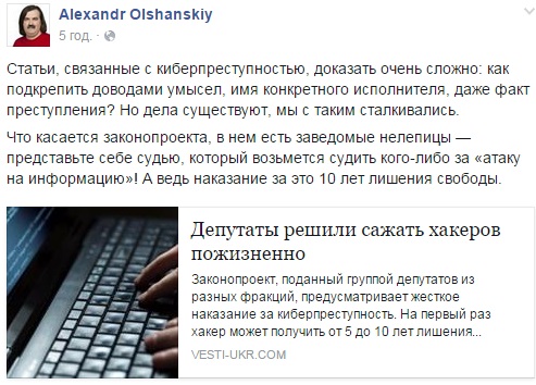 Законопроект 2328а был поддержан на заседании НКРСИ и особо не критиковался общественностью. А вот к 2439а у юристов и экспертов возникла масса вопросов. К примеру, президент группы компаний "Интернет Инвест" Александр Ольшанский написал на своем Facebook следующее:
